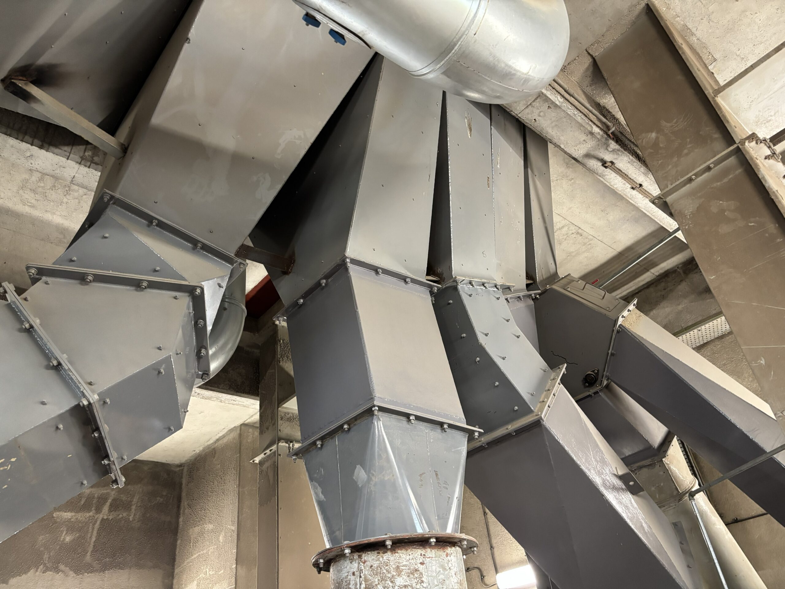 Multiple chute work connections into the over silo chain conveyors offering route flexibility from the new 6-way multi distribution valve located beneath the intake belt & bucket elevator heads